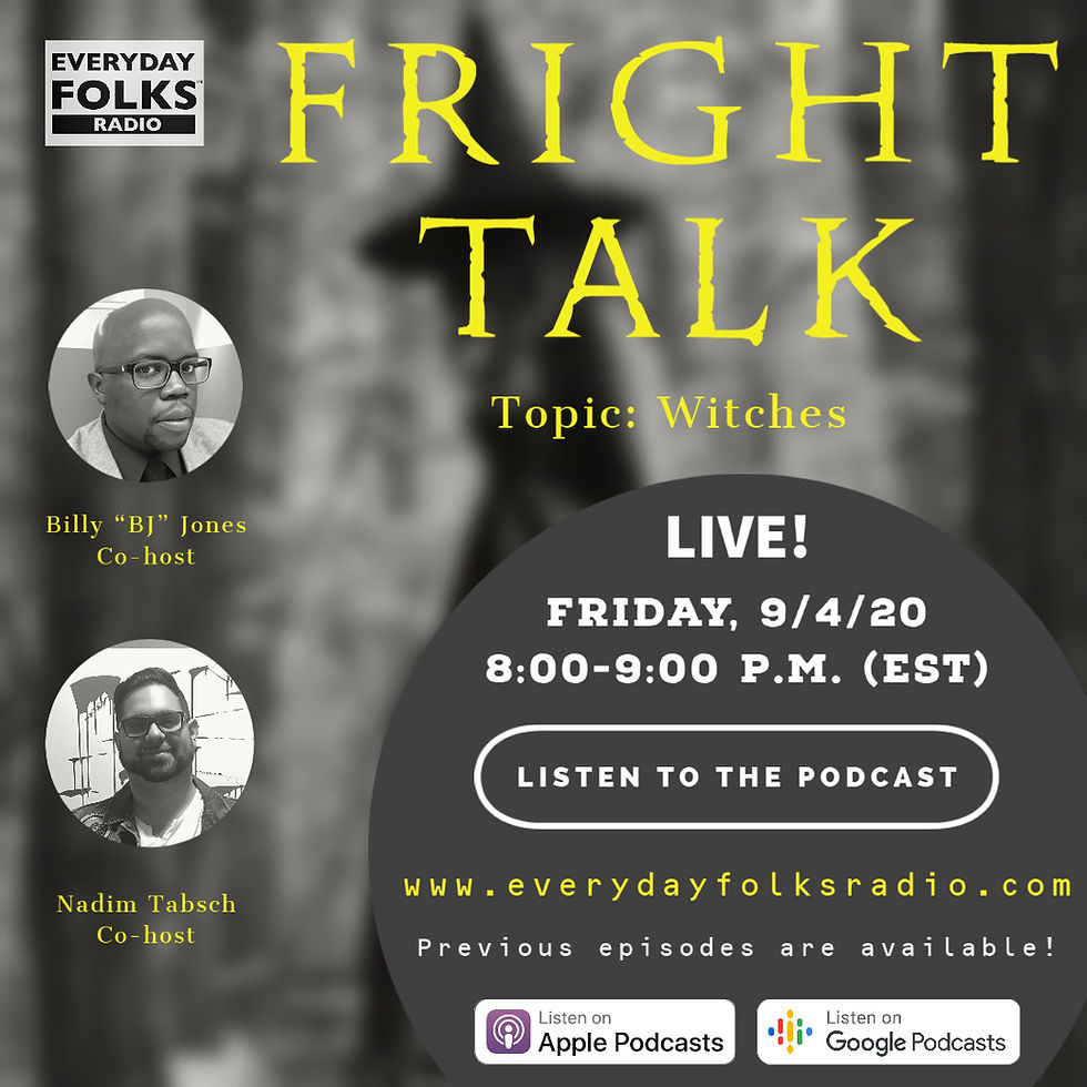 Join Billy "BJ" Jones and Nadim Tabsch for a live episode of Fright Talk: Witches on Friday, 9/4/20, from 8:00-9:00 p.m EST.